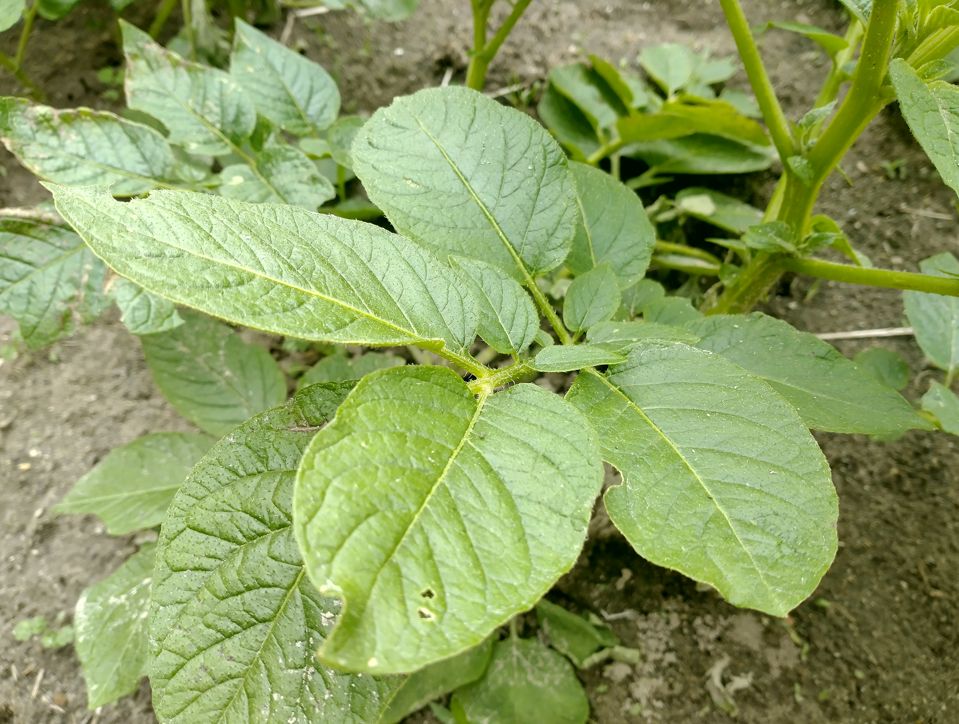 じゃがいもの葉は、育ってくると少しざらっとした手触りになる。細かい毛が生えていて、光の当たり方で白っぽく見えることがある。触るとちょっとべたっとするのも特徴で、最初は病気かと思って焦ったが、これが普通らしい。