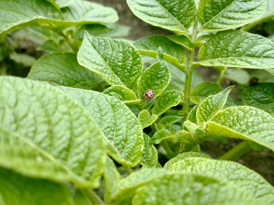 テントウムシは益虫として知られていて、アブラムシを食べてくれる。じゃがいもはアブラムシがつきやすい野菜のひとつで、放っておくと葉が傷んで生育が悪くなる。テントウムシがいるということは、アブラムシが来ていて、それを食べにきた可能性が高い。