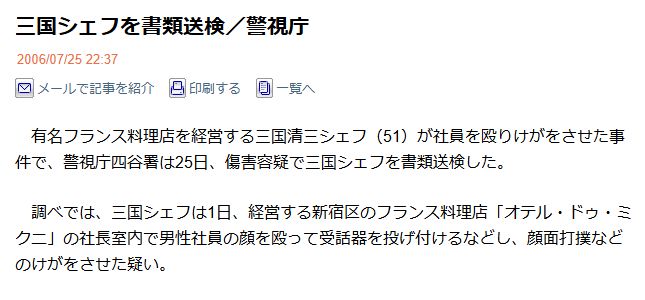2006年、三國シェフはレストランの社員男性に対して電話の受話器を投げつけ、さらに顔を殴ったという事件を起こしています。理由は「仕事が遅いことに腹を立てた」からとのことでした。被害を受けた社員はその日のうちに警視庁四谷署に被害届を提出し、三國清三さんは傷害容疑で書類送検されています。