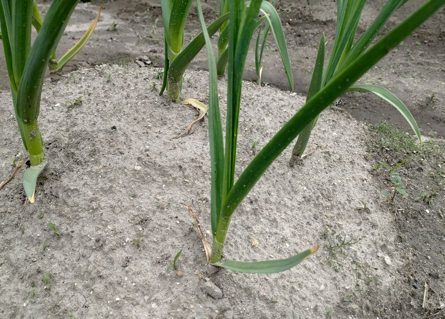 ニンニクの地上部は「葉」なのだが、根元に近い部分はかなりしっかりしている。触ると硬くて、グラつきがない。これは地中で球が形成されつつある証拠でもあって、上に伸びる葉の太さと地下の球の充実度は連動しているらしい。