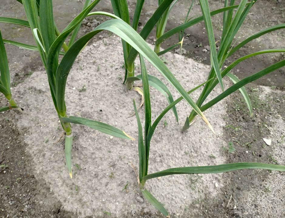 📖 葉の枚数と鱗片の関係:ニンニクは葉の枚数と地中の鱗片の数がほぼ対応する。葉が多い株は収穫時のかけ数も多い傾向がある。葉の状態を見れば、地中の様子をある程度推測できる。