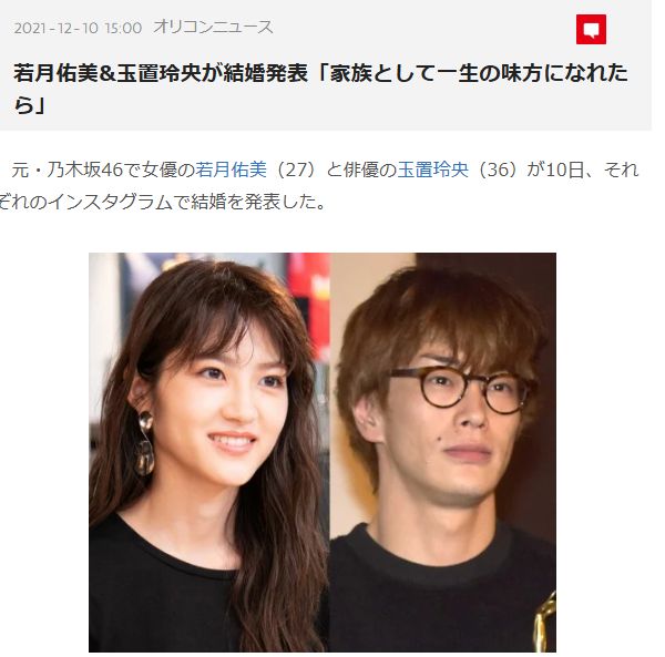 • 玉置玲央は2021年12月10日に若月佑美と結婚を発表